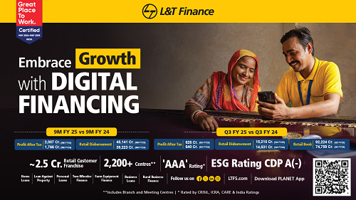 L&T Finance Ltd. (LTF), one of the leading Non-Banking Financial Companies (NBFCs) in India has recorded a consolidated Profit After Tax (PAT) at Rs. 2,007 Crore for the nine months ended December 31, 2024, a growth of 14% over nine months ended December 31, 2023. The consolidated PAT for the third quarter ended December 31, 2024 stood at Rs. 626 Crore.